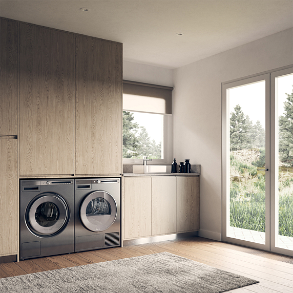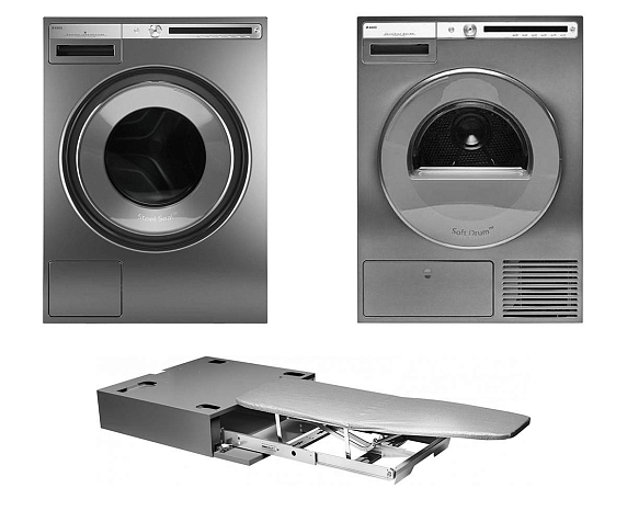 Комплект Asko Logic 8 (W4086C.T/3, T408HD.T.P, HI1153T) выглядит современно и стильно за счёт лаконичного дизайна, корпусов титанового цвета и стальных элементов. Линейка Logic отличается высокой функциональностью и степенью комфорта. Например, оба прибора работают за счёт инверторного двигателя. У него высокая производительность и сниженный износ деталей. В набор также входит складная гладильная доска из серии ProHome. Она устанавливается между стиральной и сушильной машинами и выдвигается из ящика только при необходимости. В иных случаях она закрыта декоративной панелью.