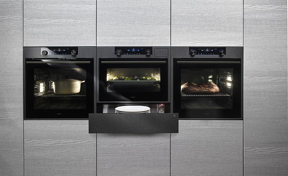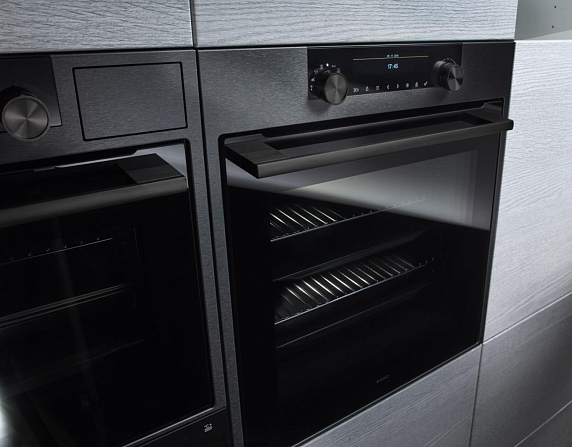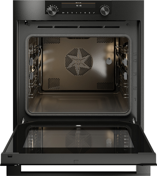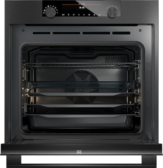 Шкаф выполнен в элегантном цвете "черная сталь", что подчеркивает его современный и универсальный облик. Панель управления оснащена сенсорным экраном и поворотными регуляторами, обеспечивая интуитивное управление всеми режимами. Корпус изготовлен из высококачественной нержавеющей стали, устойчивой к коррозии и механическим повреждениям, а дверца дополнена многослойным термостойким стеклом, которое гарантирует безопасность и комфорт при использовании.