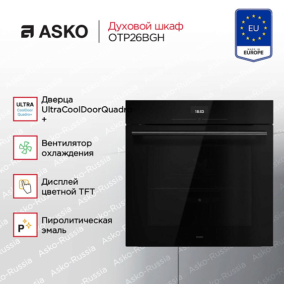 Духовой шкаф ASKO OTP26BGH — это современное решение для тех, кто ценит качество и стиль в каждой детали интерьера. Это устройство отличается изысканным дизайном, который удачно сочетает в себе эстетику и функциональность. Черное стекло фасада придает ему строгость и элегантность, а цветной TFT-дисплей делает управление интуитивно понятным и удобным.