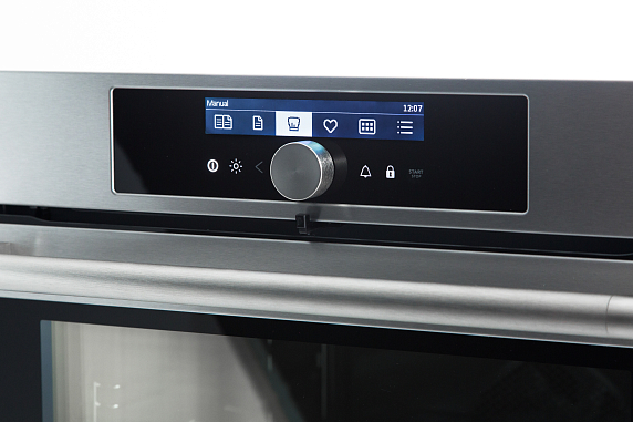 Управление ручкой JogDial представляет собой два утапливаемых поворотных регулятора. Они плавно переключают параметры, выводимые на чёткий текстовый дисплей. Как правило, такая система навигации состоит из двух ручек. С помощью левой можно настраивать необходимые режимы функционирования духового шкафа. Правая же отвечает за выбор настроек.