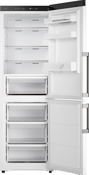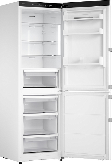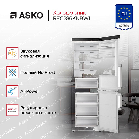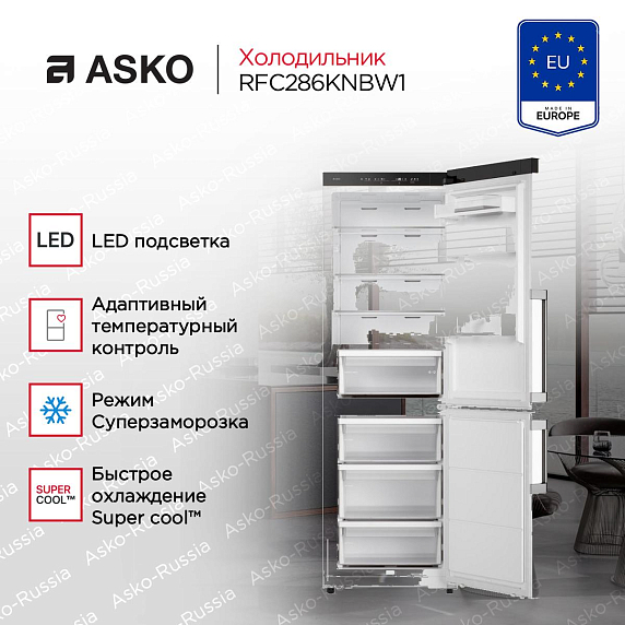 Модель ASKO RFC286KNBW1 внешне выглядит лаконично: светлый корпус без ярких акцентов легко встраивается в любую кухонную обстановку — от скандинавского минимализма до классики. Его габариты — 185×59×59 см — делают его высоким, но узким, что идеально подходит для стандартных ниш или размещения вдоль стены без ущерба для свободного пространства. Управление реализовано через встроенную сенсорную панель с дисплеем, которая органично вписана в фасад — никаких выступающих элементов, только чистые линии. Внутри — 306 литров полезного объёма: 200 л отведено под холодильную камеру, а 106 л — под нижнюю морозилку, состоящую из трёх отсеков и одного выдвижного ящика для удобного доступа. Четыре прочные стеклянные полки выдерживают даже плотную загрузку и легко моются, на дверце — три полочки плюс специальная зона под бутылки, что особенно удобно для хранения напитков. Светодиодная подсветка равномерно освещает всё пространство, а настройка температуры происходит через сенсорный дисплей с адаптивной системой, автоматически корректирующей режимы под текущую обстановку внутри камер.