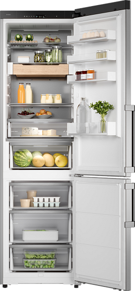 Внутреннее пространство холодильника продумано до мелочей: вместительные полки и ящики позволяют удобно разместить все необходимые продукты. Благодаря регулируемым полкам вы сможете адаптировать внутреннее пространство под свои нужды, а специальные отсеки для овощей и фруктов сохранят их свежесть на длительное время.