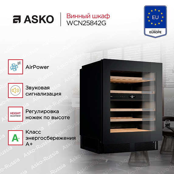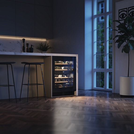 Компрессор обеспечивает равномерное охлаждение воздуха внутри шкафа, а автоматическая система размораживания избавляет от необходимости вручную удалять иней и поддерживать оптимальные условия хранения. Стеклянная дверь придает модели элегантный вид, делая его не только функциональным, но и декоративным элементом интерьера. Длина кабеля подключения — два метра, так что можно ставить не вплотную к розетке. Модель очень тихая, всего 35 дБ. При работе компрессор издает звук не громче шепота. Идеально подойдет для домашнего использования, для бара или ресторана, а также для офиса или гостиничного номера, обеспечивая вашим гостям возможность насладиться изысканными винами в любое время.