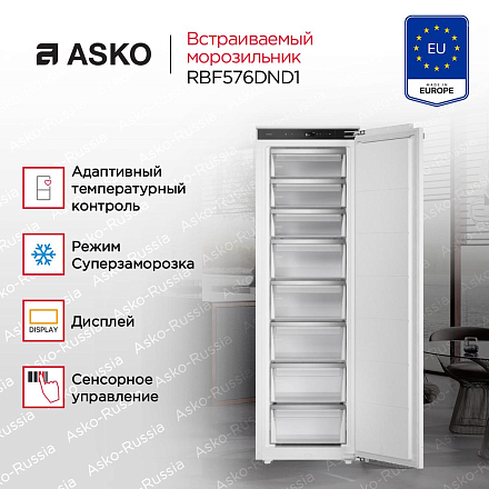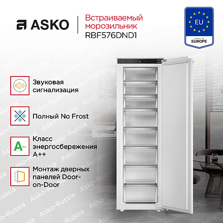 Встраиваемая морозилка ASKO RBF576DND1 выполнена в светлом, нейтральном оттенке, который идеально сочетается с любыми фасадами. Благодаря системе Door-on-Door вы можете установить родную дверцу кухонного шкафа прямо на корпус — результат: ровная поверхность без визуальных разрывов. Дверной упор расположен справа, что упрощает планировку открывания под вашу кухню. Габариты корпуса — 177 см в высоту и 54 см в глубину — рассчитаны на стандартную нишу размером 177,5-178 × 56-57 × 56 см, поэтому при монтаже важно соблюсти точные размеры проёма.