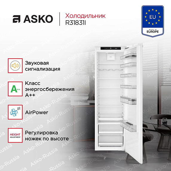 Встраиваемый холодильник Asko R31831I представляет собой однокамерную модель серии Premium. Такое устройство работает за счёт инверторного компрессора, который отличается длительным сроком службы, разумным потреблением электроэнергии, а также более низким уровнем шума. Жёсткое крепление типа door-on-door обеспечивает мягкое закрытие, а также возможность открыть дверцу на 115 градусов. Если угол менее 15 градусов, то дверцы закроется автоматически. Капельная система охлаждения подразумевает естественный микроклимат, а также периодическое подтапливание наледи на стенках, благодаря чему разморозка происходит автоматически.