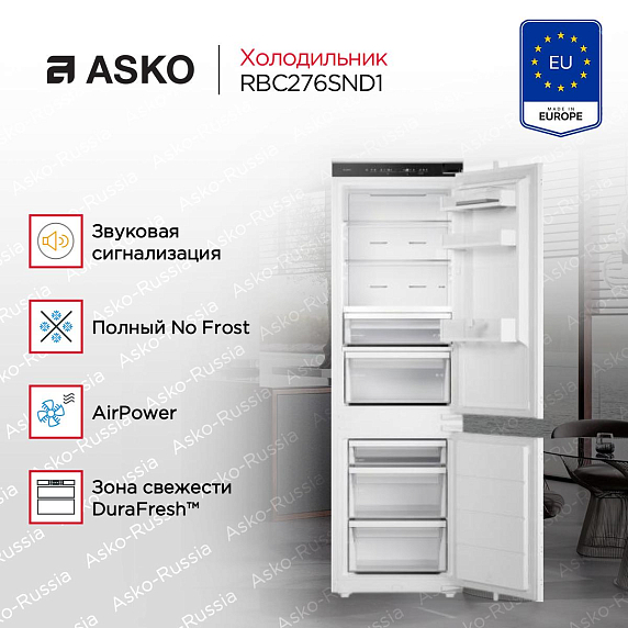 Встраиваемый холодильник ASKO RBC276SND1 внешне выглядит лаконично: светлый, почти нейтральный корпус легко вписывается в любую кухню, не нарушая общей гармонии. Её размеры — 177,2 × 54 × 54,4 см — рассчитаны на стандартную нишу 177,5-178 × 56-57 × 56 см, что обеспечивает плотную и аккуратную встройку. Благодаря системе скользящего монтажа вы можете установить родную дверцу кухонного шкафа прямо на корпус — получается единая поверхность без визуальных разрывов. Дверь по умолчанию открывается справа, но при необходимости её легко перенавесить под вашу планировку. Управление реализовано через сенсорную панель с дисплеем: интерфейс простой, без механических кнопок, а все параметры — на виду.