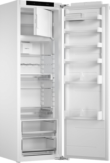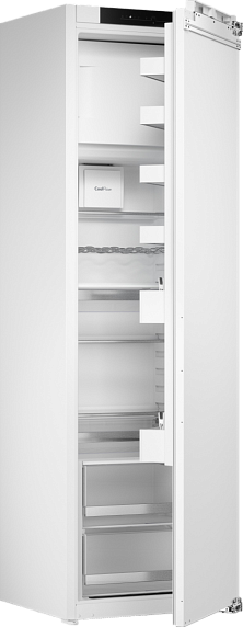 Дизайн выполнен в классическом белом цвете, что позволяет ему легко вписаться в любой интерьер. Освещение LED обеспечивает яркий и равномерный свет внутри прибора. Монтаж дверных панелей выполнен по системе Door-on-Door, а перенавешиваемая дверь позволяет установить технику в любом удобном для вас месте.