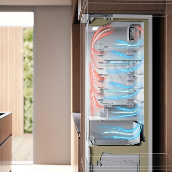 Динамическая система охлаждения обеспечивает постоянную принудительную циркуляцию охлажденного воздуха во внутренней камере холодильника. Это не только позволяет поддерживать одинаковую температуру на всех полках, но и быстро восстанавливать ее значение после открытия дверцы или загрузки свежих продуктов.