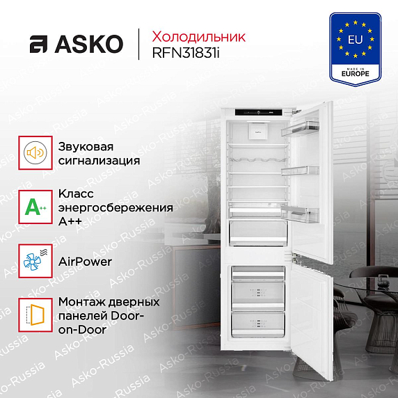 Встраиваемый комбинированный холодильник Asko RFN31831i — модель с нижним расположением морозильной камеры. Для дверей предусмотрено надежное жесткое крепление мебельных фасадов. Инверторный компрессор при пониженном потреблении электроэнергии обеспечивает длительный срок службы и низкий уровень шума. Звуковая и световая сигнализация сработают при открытой дверце или повышении температуры.