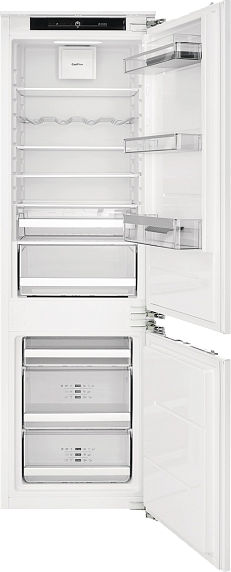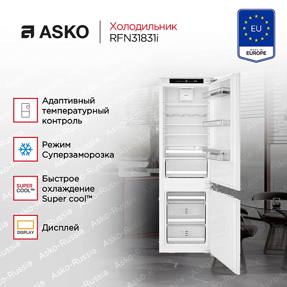 В морозильнике встраиваемого комбинированного холодильника Аско RFN31831i действует система охлаждения NoFrost, предотвращающая образования наледи на стенках и продуктах, поэтому разморозка происходит автоматически. Суперохлаждение SuperCool снизит температуру в основном отсеке, чтобы можно было быстрее охладить свежие продукты. Суперзамораживание Fast Freeze действует схожим образом, но в морозильном отделении. Датчики и сенсоры постоянно замеряют температуру внутри камер. Если адаптивная система выясняет в какое время суток чаще всего открывается дверца, то она автоматически снижает температуру к этому периоду. Она также самостоятельно регулирует процесс выработки холода в зависимости от наружной температуры помещения.