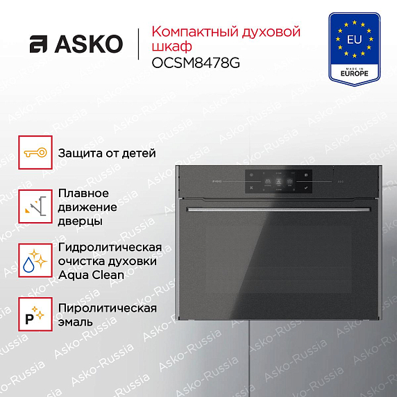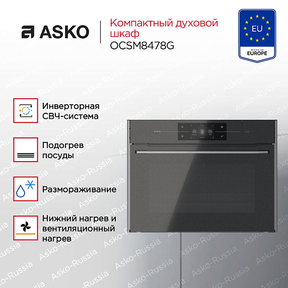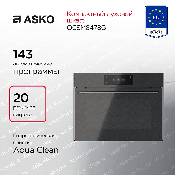 Компактный духовой шкаф Аско OCSM8478G содержит 20 режимов нагрева, 3 режима для использования микроволн, а также 6 программ для приготовления на пару. При желании можно воспользоваться уже заранее внесенными в память 143 рецептами. Автоматика запекания сделает мясо поджаристым снаружи и сочным внутри. Размораживание осуществляется при температуре 30 градусов, что позволяет максимально сохранить структуру и вкус продуктов.