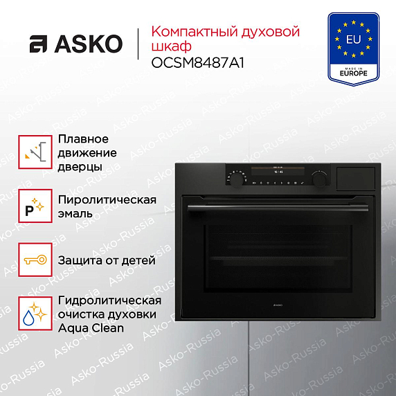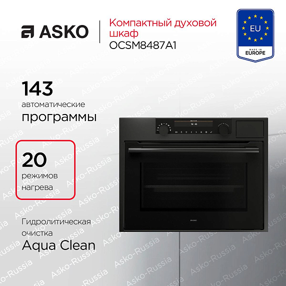 В духовом шкафу Аско OCSM8487A1 можно приготовить любые блюда, даже если в кулинарии вы новичок. 143 предустановленных программы позволяют получить без усилий пиццу, пирог, индейку, сделать су-вид и другие виды еды. Достаточно нажать кнопку — температура и время уже рассчитаны. Автоматический режим запекания мяса позволяет получить хрустящую корочку и сочную середину. При использовании микроволн не нужен поворотный стол — так что можно готовить на обычном противне. Управление электронное: сенсоры и ручные переключатели позволяют выбрать готовый рецепт или задать температуру с точностью до градуса. Есть дисплей, на котором отображаются все показатели, и таймер. Очищать камеру легко благодаря опции Aqua Clean — она обеспечивает выработку пара, который в течение получаса размягчает даже сильные загрязнения.