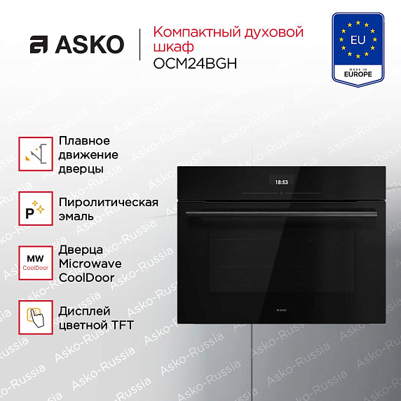 Электрический духовой шкаф Asko OCM24BGH из серии Essence объединяет микроволновую функцию и классические режимы нагрева в одном компактном корпусе. Произведённый в Словении, он поставляется с двухлетней гарантией, имеет объём 50 литров и энергоэффективность класса A++. Внешне модель выделяется строгой чёрной стеклянной панелью, цветным TFT-дисплеем и сенсорными поворотными регуляторами — решение, сочетающее эстетику минимализма с удобством управления.