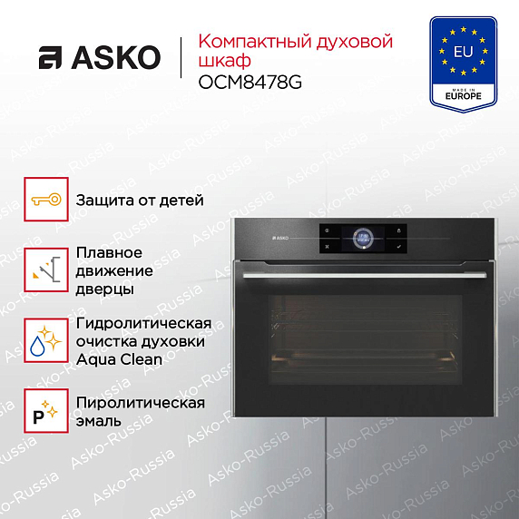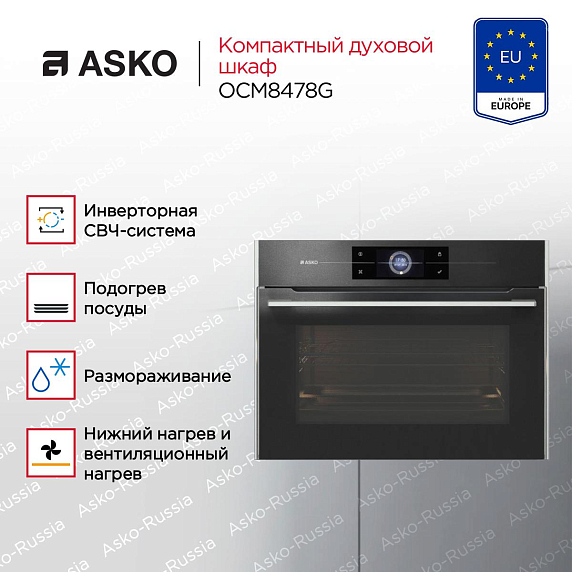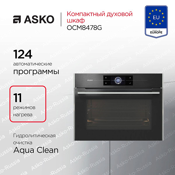 Компактный духовой шкаф Asko OCM8478G — это новое слово в кухонной бытовой технике. При стандартных размерах объем камеры составляет 50 л, что позволяет готовить блюда сразу на нескольких уровнях, экономя время. Инверторная СВЧ-система внутри продукта распределяет одинаково температуру, что особенно важно для деликатных ингредиентов и процесса размораживания. Особая технология равномерного распределения микроволн Stirrer позволяет избавиться от вращающейся тарелки, благодаря чему внутри остаётся больше места для приготовления. Продукты сохраняют вкус и питательные вещества. Устройство имеет технологию AquaClean. Она позволяет налить воду в выемку нижней часть камеры, включить нагрев. Вода испарится и загрязнения на внутренних стенках прибора размягчатся, что упростит их очистку.