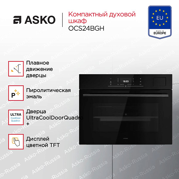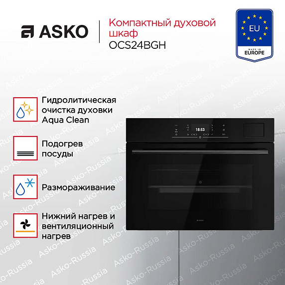 Модель ASKO OCS24BGH — это гармоничное сочетание лаконичного дизайна и передовой инженерной мысли. Её фасад из чёрного стекла органично вписывается в современные кухонные интерьеры, а минималистичные сенсорные элементы управления подчёркивают премиальный статус серии Essence. Прибор рассчитан на встраивание в стандартную нишу размером 45–45,5 × 56 × 55 см. Его внешние габариты — 45,8 см в высоту, 59,4 см в ширину и 56,4 см в глубину — при этом внутренний объём составляет 51 литр, что достаточно для повседневной готовки и кулинарных экспериментов.