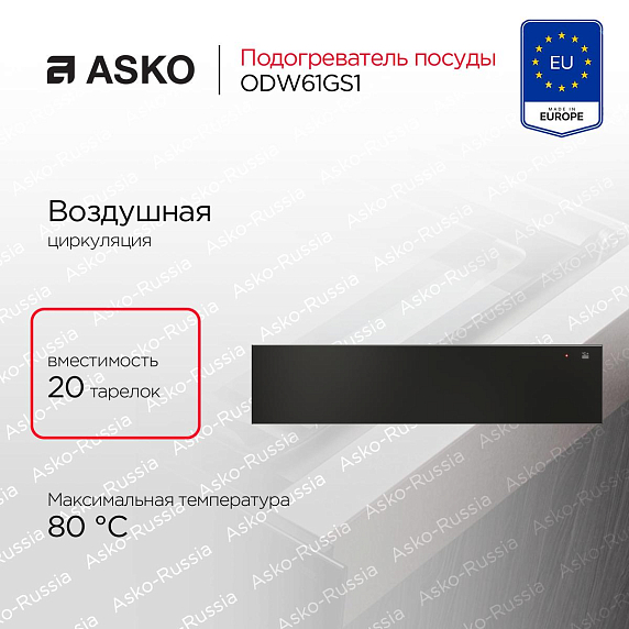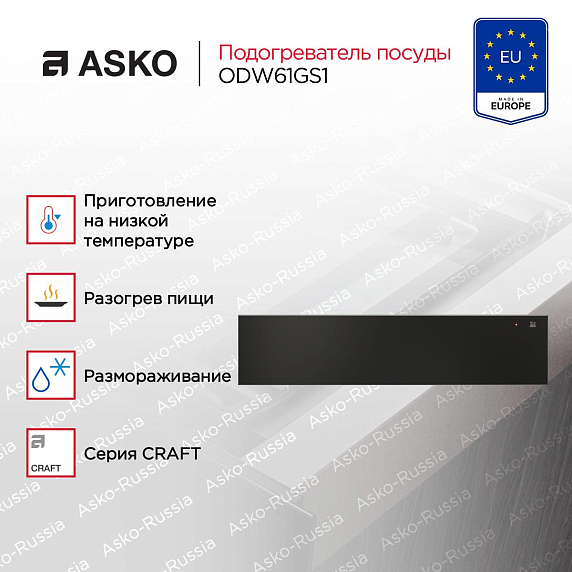 С подогревателем посуды ASKO ODW61GS1 каждый прием пищи станет настоящим удовольствием. С его помощью вы всегда сможете подать горячие блюда на предварительно подогретые тарелки, а также поддерживать температуру напитков в чашках. Благодаря 24-месячной гарантии, вы можете быть уверены в надежности и долговечности этого устройства.