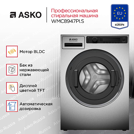 Asko WMC8947PI — это отдельностоящая прибор с фронтальной загрузкой. Она идеально впишется в любой интерьер, не требуя специального места для установки. Габариты устройства составляют: высота — 85 см, ширина — 59.5 см, глубина — 70.6 см. Такие размеры позволяют установить машину даже в небольшом помещении, не занимая много места. Основным преимуществом модели является объем барабана — 80 литров. Это позволяет загружать до 9 кг белья за один цикл стирки. Такой объем идеально подходит для больших семей или предприятий с большим количеством текстиля. Скорость отжима в данной модели достигает 1400 оборотов в минуту. Это гарантирует отличное качество отжима и минимальное время сушки белья после стирки.
