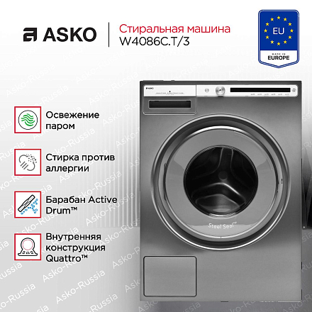 Модель имеет лёгкое электронное управление. Стиральная машина Аско W4086C. T/3 может выстирать бельё из различных материалов на 23 программах с дополнительными опциями, используя нагрев воды до 90 градусов. Большое количество программ включает такие популярные, как гигиена, антиаллергенная, экономичная, хлопок, ручная, быстрая и другие. Опции могут ускорять время стирки или замедлять, но экономить ресурсы. В данной модели есть функция освежения паром, которая может избавить от неприятных запахов чистые, но залежалые или незаношенные вещи. Можно отложить старт до 24 часов. Для безопасности внедрены функции защиты от протечек и переполнения, блокировки от случайного перепрограммирования детьми. Дверцу невозможно открыть во время работы. Возникший дисбаланс машина устраняет самостоятельно.
