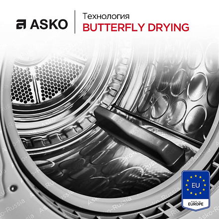 На цветном TFT-дисплее отображается информация о текущем режиме работы, оставшемся времени и других параметрах. В модели предусмотрена регулировка остаточной влажности, что позволяет выбрать наиболее подходящий режим сушки для различных типов тканей. Корпус выполнен из нержавеющей стали, а панель управления — черного цвета, что придает ей современный и стильный вид.