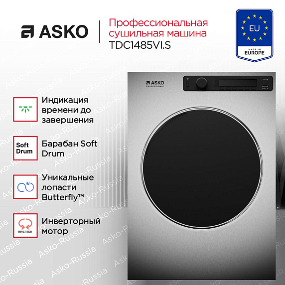 Особенностью прибора является инверторный мотор, который обеспечивает более тихую и энергоэффективную работу. Барабан из нержавеющей стали Soft Drum™ с реверсивным вращением обеспечивает бережное обращение с бельем и равномерное распределение тепла. Устройство оснащено 17 программами сушки, включая автоматические программы, сушку по времени и сушку «под утюг». Также в нем предусмотрена функция таймера отсрочки старта и индикация времени до завершения программы.
