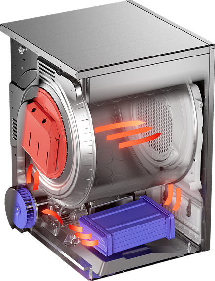 Принцип работы заключается в том, что на белье воздействует сильный поток горячего воздуха, благодаря чему из одежды испаряется влага, то есть происходит конденсация воды. Затем воздух вновь подается к нагревательному элементу, а оттуда — снова нагретым — он поступает на белье. И так по кругу, до тех пор, пока содержимое барабана не станет сухим.