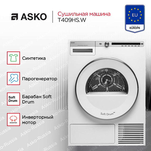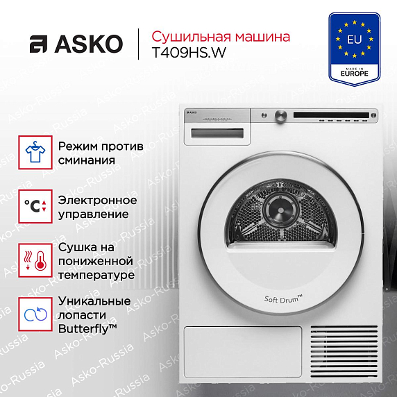 Сушильная машина Asko T409HS.W — модель с тепловым насосом и запатентованным барабаном SoftDrum. Предназначена для домашнего использования, может устанавливаться сверху на стиральную машину или сбоку.
