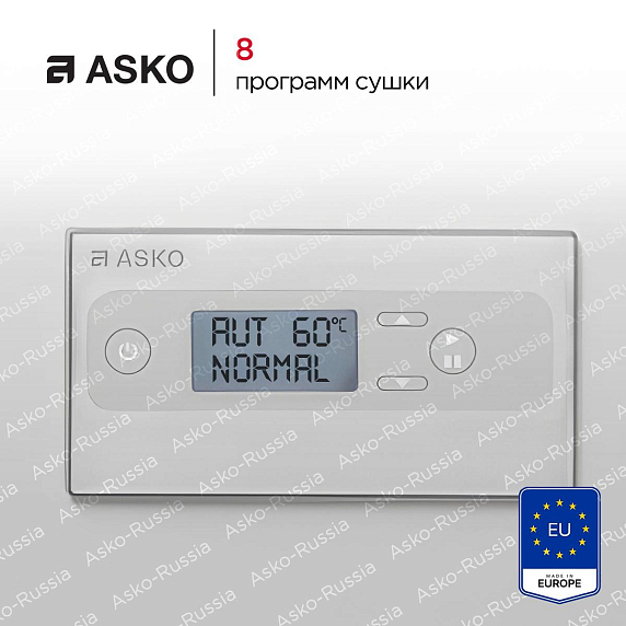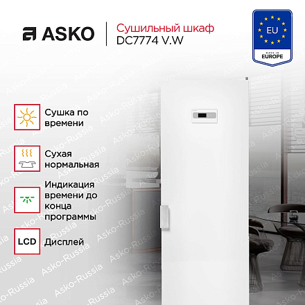 В автоматические программы сушильного шкафа Аско DC7774 V.W входят нормальный и экстрарежимы. Они могут функционировать как на 40, так и на 60 градусах. Температура зависит от того, что написано на этикетке одежды. В ручную настройку входят программы на 30, 40 и 60 градусов, а также ECO-режим. При энергосбережении сушка осуществляется не за счёт нагревания, а за счёт работы вентилятора. При минимальных 30 градусах можно самостоятельно выставлять длительность цикла. Такой вариант подойдет для изделий из деликатных тканей.