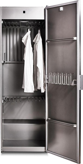 Прибор является отдельно стоящим и подключается к вентиляции для эффективной работы вытяжной системы. Перенавешиваемая дверь обеспечивает удобство эксплуатации вне зависимости от расположения. Нагревательный элемент и вентилятор находятся в верхней части, что обеспечивает максимально эффективное движение теплого воздуха. Наличие термовыключателя помогает регулировать температуру внутри, а плотно закрывающаяся при помощи уплотнительной ленты дверь снижает уровень шума.