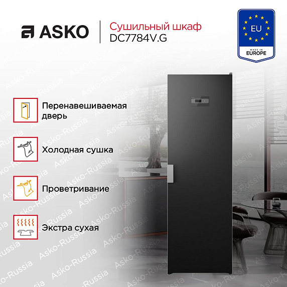Сушильный шкаф ASKO DC7784V.G — стильный прибор цвета графит, сочетающий аккуратный внешний вид и практичность. Высота 184 см при ширине 59,5 см и глубине 60,8 см делает модель удобной для установки в отдельной зоне или в нише, а возможность крепления к стене расширяет варианты размещения и увеличивает устойчивость. Внутреннее пространство предусматривает общую длину вешалок 16 м, одну полку для обуви и держатель для перчаток, при этом максимальная загрузка одежды составляет 4 кг. Управление электронное с кнопочными переключателями, информативный дисплей отображает время до конца программы, предусмотрен выбор температуры и восемь программ с сушкой вентилируемого типа: сухая нормальная, экстра, сушка по времени, холодная и проветривание для свежести вещей. Конструкция снабжена складными секциями вешалок с телескопическими направляющими и перенавешиваемой дверью для удобства при интеграции в разное пространство.