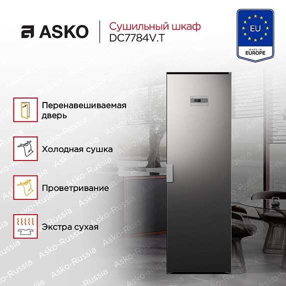 Сушильный шкаф ASKO DC7784V.T — элегантное и функциональное решение для щадящей обработки деликатных изделий в домашних условиях. Внешняя отделка цвета титан и панель управления из нержавеющей стали подчёркивают премиальную эстетику, при этом корпус выполнен из прочной нержавейки, обеспечивающей простоту ухода и устойчивость к коррозии. Высота 184 см при ширине 59,5 см и глубине 60,8 см делает прибор компактным, хотя вместимость рассчитана на 4 кг тканей; общая длина вешалок достигает 16 метров, что позволяет аккуратно развесить блузы, рубашки, пальто и аксессуары. Возможность установки в нише либо закрепления к стене добавляет свободы при планировке интерьера. Дверной упор расположен справа по умолчанию, но дверцу можно перенавесить под нужное расположение, а встроенный дверной выключатель обеспечивает безопасность при работе.