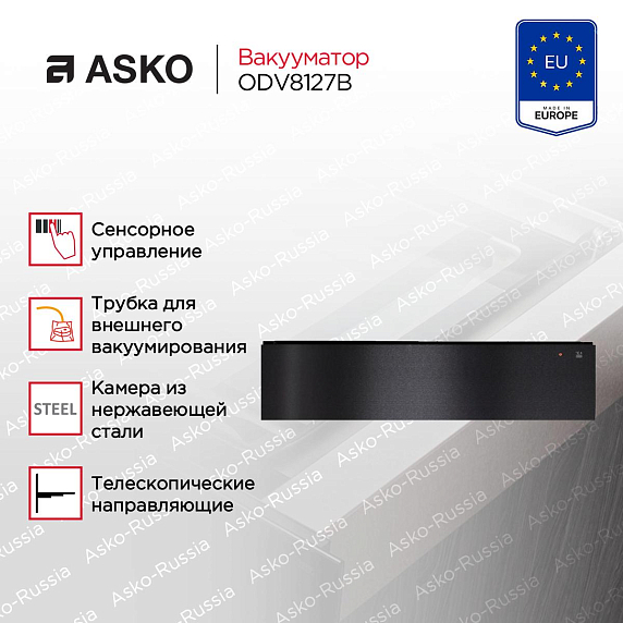 Вакууматор Asko ODV8127B станет незаменимым помощником на Вашей кухне. Устройство работает со стандартными пакетами 25×35 см, что делает эксплуатацию удобнее. Товар выполнен в цвете черная сталь, что подойдет к любой кухне и дополнит его интерьер. Управление осуществляется за счет сенсорной панели, которая находится за фронтальной частью. Благодаря этому она защищена от пыли и других воздействий. Интуитивно понятные кнопки делают навигацию простой и удобной. Выдвигается устройство на телескопических направляющих с фиксацией. Это помогает легко открывать и закрывать девайс. Открывается данная техника по принципу touch2Open. То есть необходимо нажать на фронтальную часть, тогда механизм сработает. Отсутствие ручек гарантируют безопасность данного процесса.