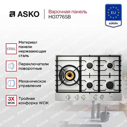 Варочная панель Аско HG1776SB имеет механический тип управления. Удобные поворотные переключатели обеспечивают быстрое и безопасное включение конфорок и регулировку пламени в них. Встроенный в переключатели механизм активации электроподжига избавляет Вас от опасности обжечься, слишком близко протянув руку к конфорке. Пламя загорается простым поворотом переключателя, без использования спичек и зажигалок, что гарантирует безопасную и комфортную эксплуатацию. Данной функцией оснащена каждая конфорка. Благодаря наличию комплекта для переоборудования, использовать технику можно не только с подключением к центральному газоснабжению, но и к баллону со сжиженным газом.