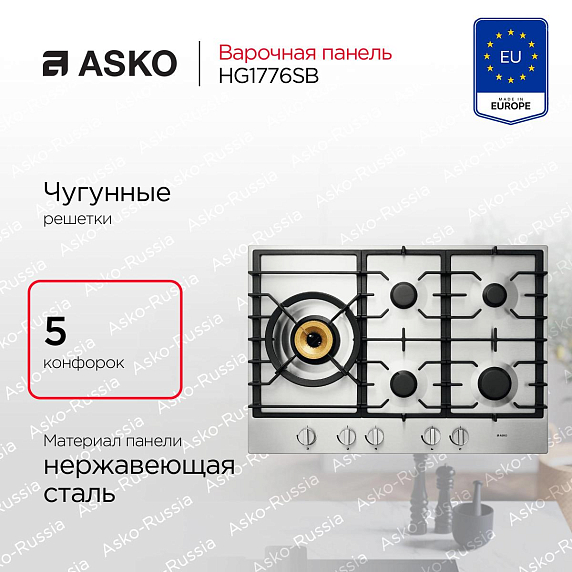 Варочная панель Asko HG1776SB выполнена в классическом цвете нержавеющая сталь и дополнена фурнитурой одной горелки в цвете «Бронза». Товар выполнен из устойчивой к выгоранию и царапинам эмалированной стали, а съемные подставки для посуды — из чугуна. Девайс отличается простотой и удобством в эксплуатации. Оборудование органично впишется в интерьер кухни, а также не займет у вас много пространства: его высота составляет 4,8 см, ширина — 75 см, глубина — 52,6 см.