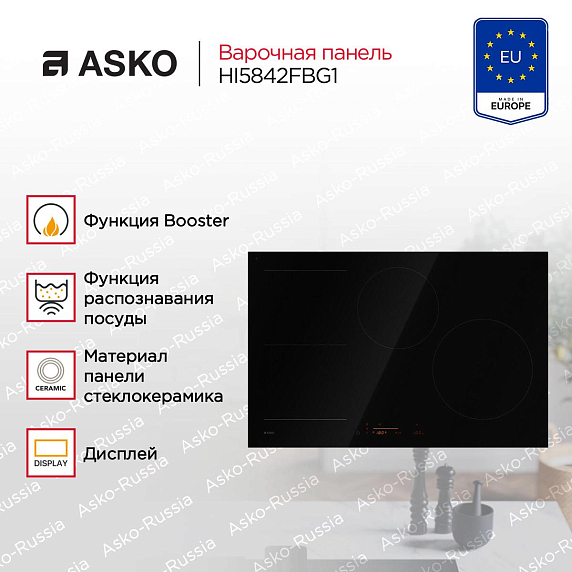 Asko HI5842FBG1 обладает рядом инновационных функций, таких как Booster для ускоренного нагрева, функция распознавания посуды, функция Stop&Go для временной остановки процесса приготовления, функция Bridge для объединения зон нагрева и другие. Дополнительные функции включают индикацию остаточного тепла, блокировку от детей, а также специальные программы для жарки, гриллирования, кипячения, разогрева и поддержания температуры, медленного приготовления и приготовления по методу су-вид.