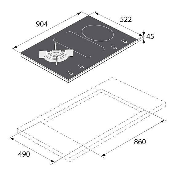 Конструкция оборудования предусматривает наличие газовой конфорки повышенной мощности Fusion Volcano WOK 6 кВт, а также 3 индукционных зон нагрева, 2 из которых имеют возможность объединения в одну. Поверхность выполнена из специального матового стекла MattBlack. В целях безопасности предусмотрена система газ-контроль, благодаря которой подача газа перекрывается в случае, если пламя конфорки угасло.